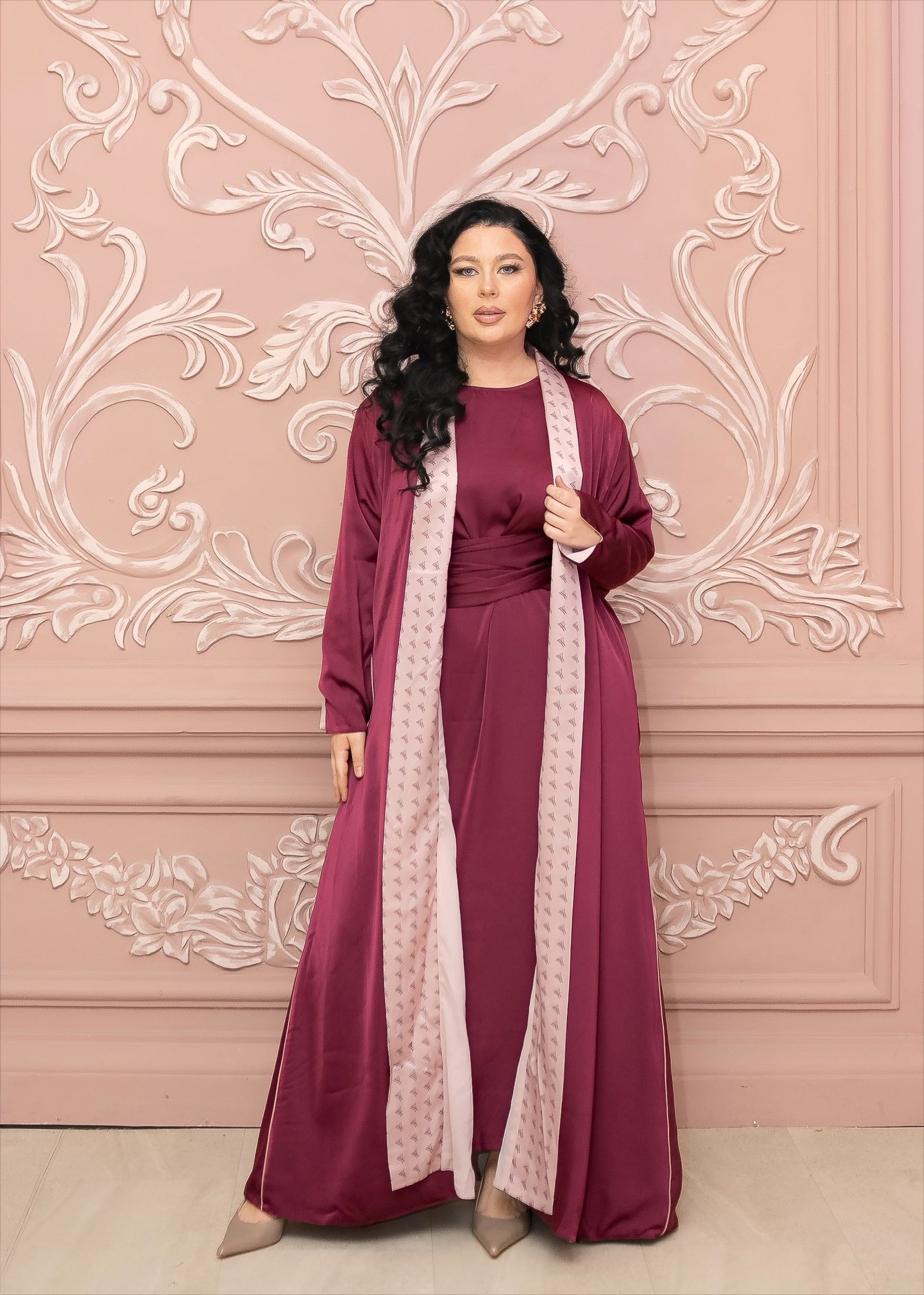 The abaya comes as a two-piece set with a flowing outer abaya and a sleeveless underdress in the same color and fabric. The underdress has side ties at the waist that you can adjust for a fitted look. This abaya is stylish, comfortable, and perfect for any occasion.